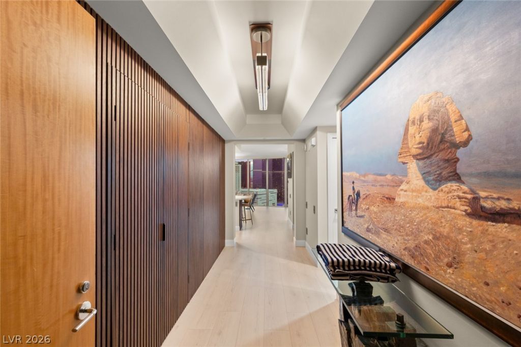 Perched on the 31st floor of Turnberry Towers, this fully reimagined 2-bedroom + den, 2-bath residence spans 1,657 sq ft and showcases rare wraparound floor-to-ceiling windows with sweeping views of the Las Vegas Strip, Sphere, Stratosphere, and downtown. The only true chef's kitchen in the building features hood ventilation, custom walnut cabinetry, and new appliances. Spa-inspired baths are finished in Thassos and Namaste marble, including a primary suite with soaking tub. Additional upgrades include wide-plank flooring, polished nickel hardware, Legrand Adorne electrical, LED lighting, acoustic paneling, and fully redone plumbing. Turnberry Towers offers guard-gated, resort-style living just minutes from the Strip. A rare, highly upgraded high-rise opportunity.