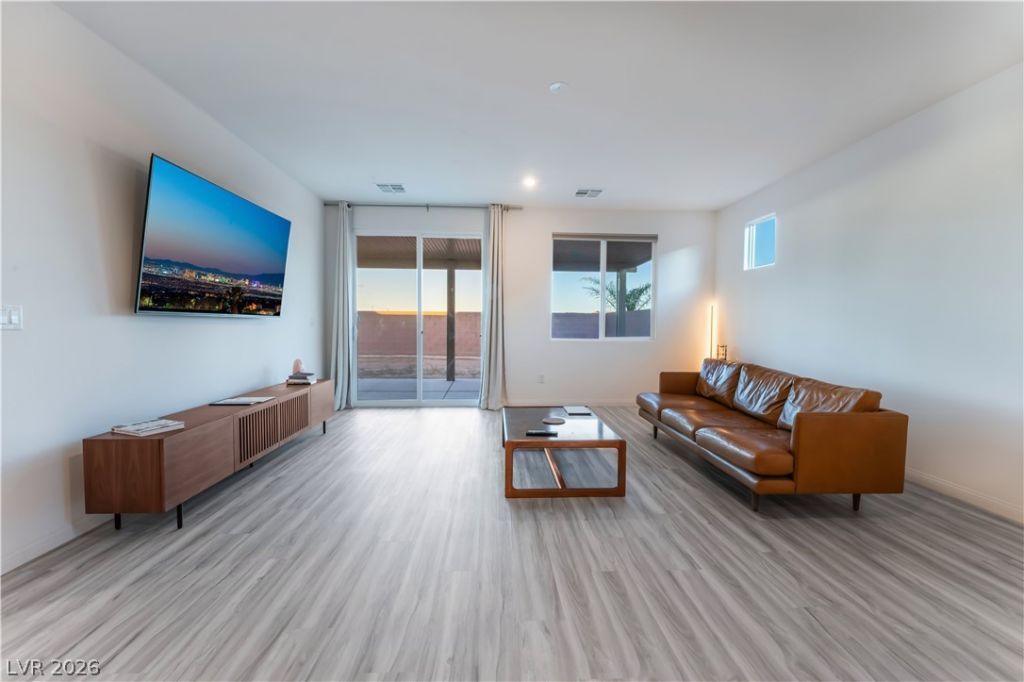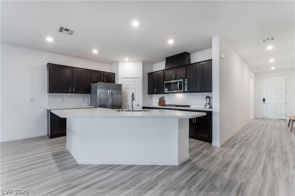 SINGLE STORY PERFECTION! MODERN DESIGN & MOVE-IN READY! SPACIOUS 2,193 sq ft home offers 3 BEDROOMS, 2.5 BATHS & an HUGE DEN/OFFICE w/French doors. Open Concept Floorplan, CONTEMPORARY FINISHES & LUXURY VINYL PLANK flooring throughout**NO CARPET**Meticulously maintained, home feels like new, shoes never worn inside. Chef's kitchen features QUARTZ COUNTERS, LARGE ISLAND W/BARTOP SEATING, BUILT-IN OVEN, 5-BURNER COOKTOP, MATCHING STAINLESS STEEL APPLIANCES & PANTRY. Primary Suite has spa-like bath,step-in shower, deep walk-in closet, dual vanities AND a linen closet. Enjoy the SPRAWLING LIVING ROOM that flows seamlessly to the**$15,000 FULL LENGTH COVERED PATIO with an EXPANDED CONCRETE PAD, perfect for outdoor entertaining. HIGHLIGHTS: a separate laundry room, TANKLESS WATER HEATER & 220V EV OUTLET in garage. Prime location near Desert Horizon Park, Explore Academy LVS & North Las Vegas Airport. Ideal for those seeking a spacious, pristine, and stylish single-story home!