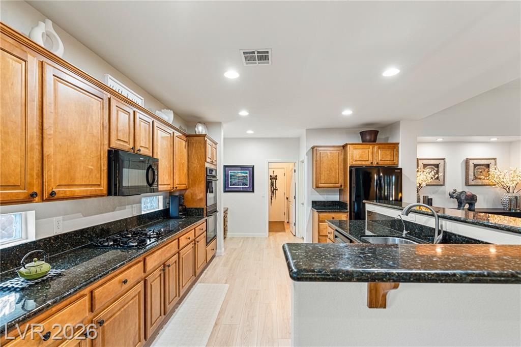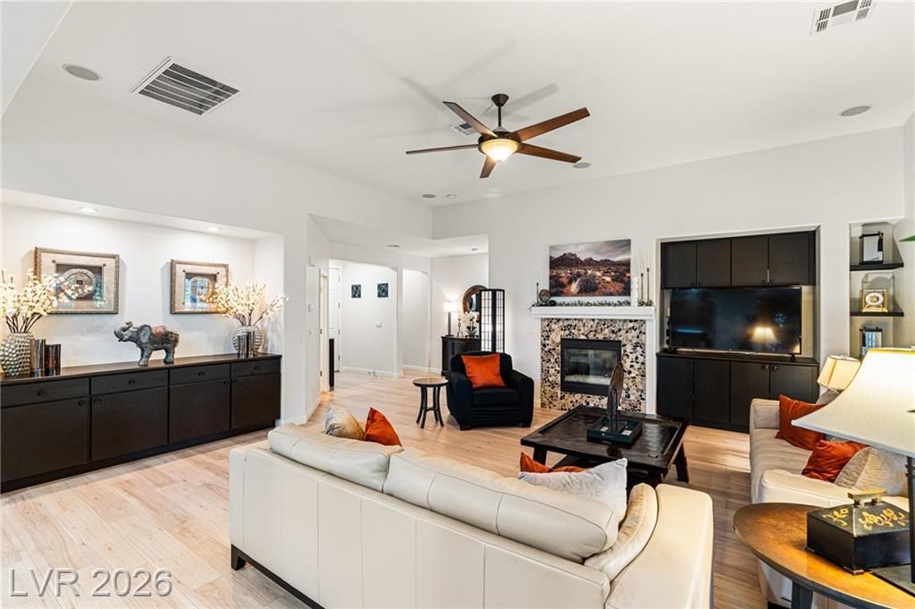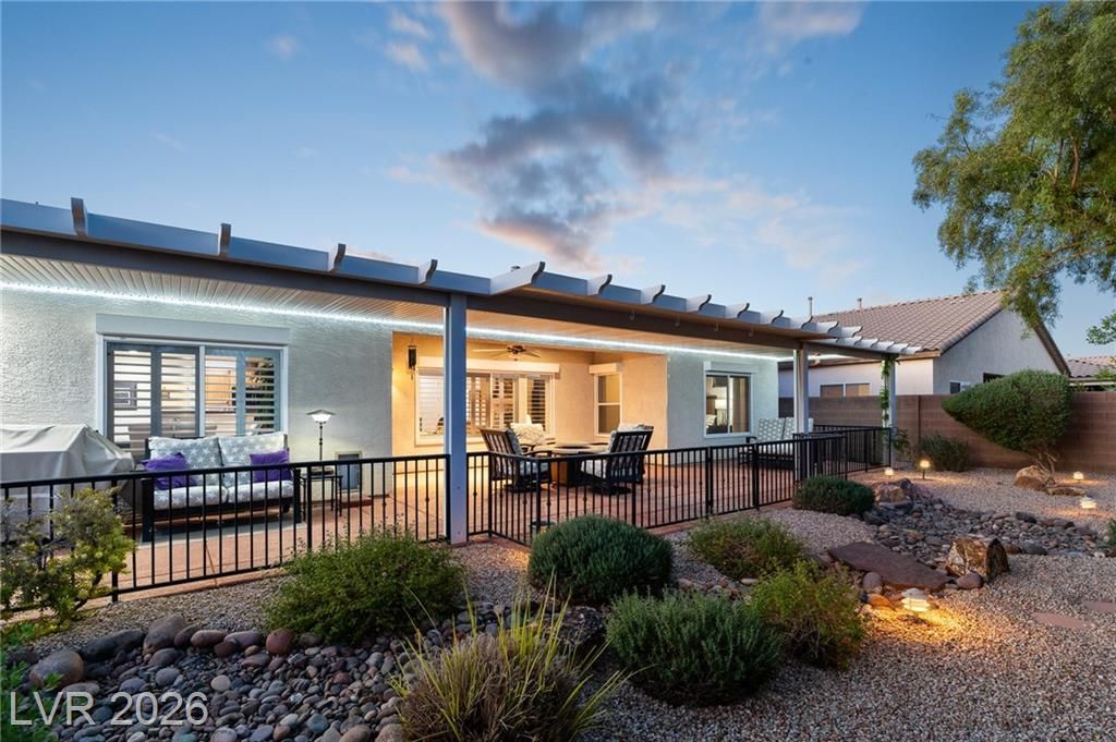 Highly upgraded home in a gated, all single-story community with a 3-car garage and serious curb appeal! This home delivers an outdoor oasis with a huge covered patio, ceiling fans, lighting and lush mature landscaping?built for relaxing or entertaining. Inside, the chef's kitchen steals the show with an oversized island, granite countertops, custom tile backsplash, sleek black appliances, double ovens and included fridge. The spacious dining area flows seamlessly to the patio, while the great room impresses with 12' ceilings, fireplace, media cabinet and custom built in buffet. Every bedroom features a walk-in closet and the primary suite offers the space you've been looking for. Upgrades include Rolladen security shutters, ornamental security door, dual HVAC (replaced 2023), tankless water heater, water softener, RO system, built-in speakers throughout, new LVP flooring and a smart garage opener. Immaculately maintained with true pride of ownership?this one stands out.