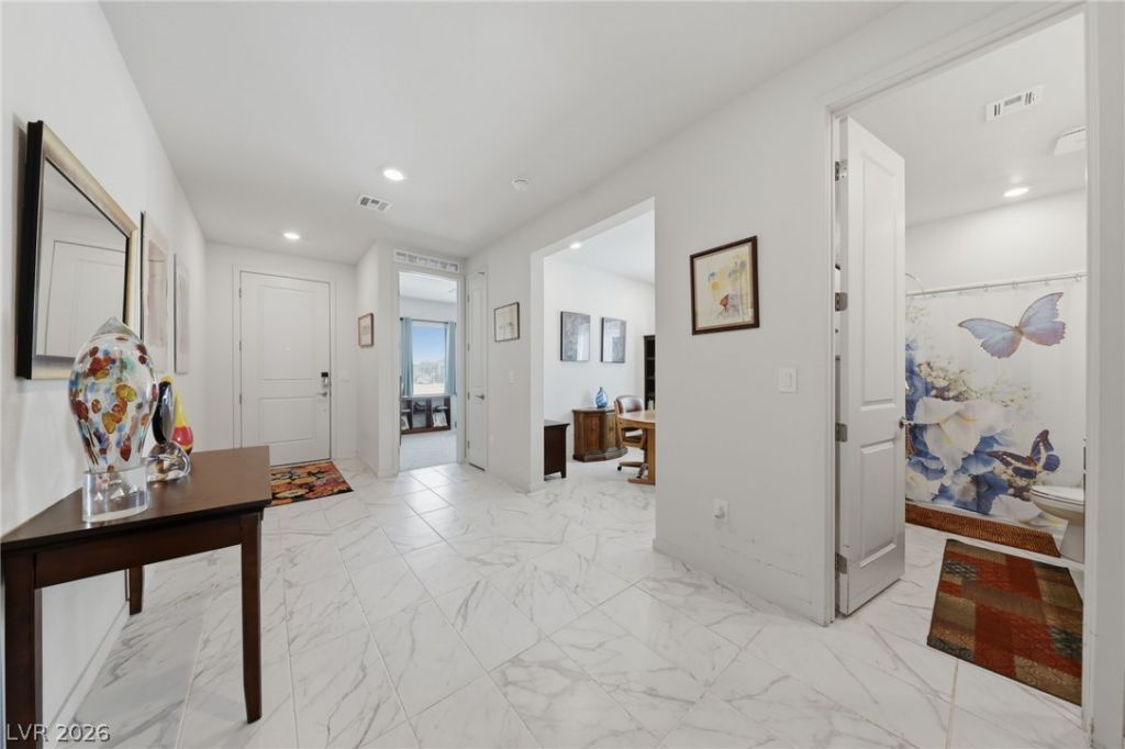 This Impeccable Single Story Pool Home is ready for you to call home! Showcasing an incredible Backyard complete with Heated Pool and Spa, along with PAID OFF SOLAR, home is located in a Gated Community and features plenty of Natural Light and countless upgrades throughout including: Upgraded Tile Flooring, Ceiling Fans in Bedrooms, 8' Interior Doors, 42 Custom Cabinets, Sizable Den, Stainless Steel Under mount Kitchen Sink, Stainless Steel Appliances in Kitchen, Water Filtration System, & Water Softener in Garage. The spacious Primary Bedroom exhibits Ceiling Light, Walk in Closet, and an impressive Primary Bath that holds Double Sinks and a Super Shower with cultured marble pan and walls. Separate Laundry Room includes Washer & Dryer. Enjoy Pool Nights year round in your Backyard Oasis complete with Heated Pool/Spa Combo, Covered Patio, Finished Landscaping, and Synthetic Grass. Located within minutes of various shopping Centers, and the 215 Highway. A must see!