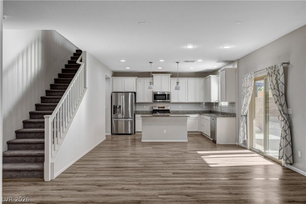 Come see this charming 3-bedroom home built in 2016 by D.R. Horton! This thoughtfully designed open floor plan offers an ideal space for entertaining, featuring a spacious living room pre-wired for surround sound. The kitchen is equipped with stainless steel appliances, granite countertops, and a generous pantry, making it both functional and stylish. All bedrooms are located upstairs, including the primary suite with dual walk-in closets. The home also features a versatile loft area upstairs?perfect for a home office, playroom, or additional living space. Coming outside to enjoy the spacious backyard, complete with a covered patio, pavers, and a cozy fire pit?perfect for relaxing or hosting gatherings. Conveniently located with easy access to the 215 Beltway and just minutes from the airport, Spring Valley Costco, Durango Casino, and UnCommons shopping center. Welcome home!
