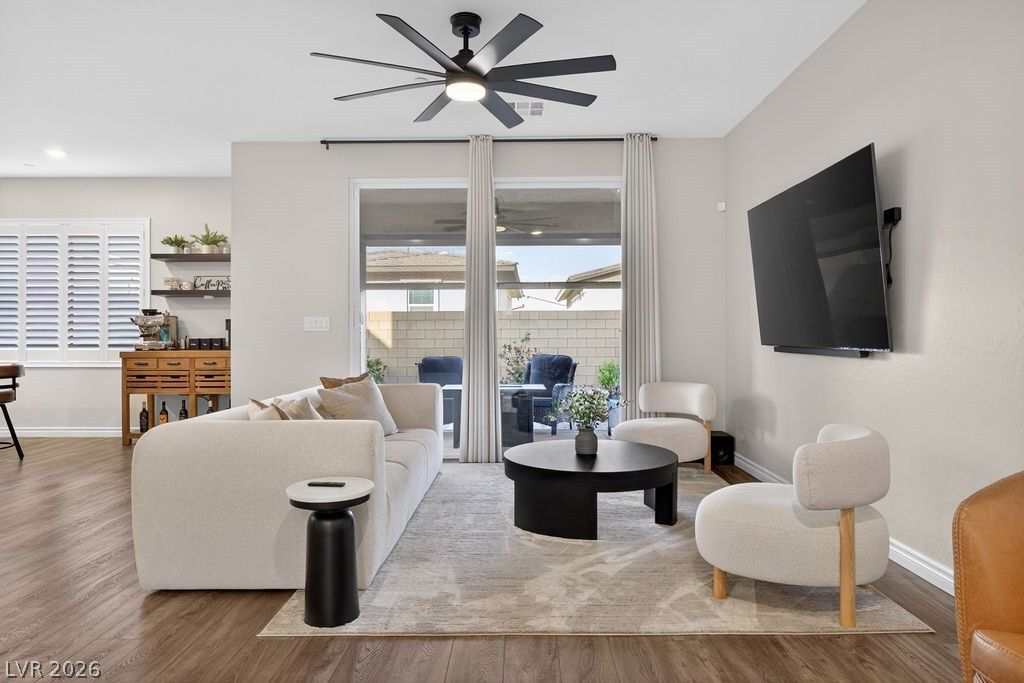 Impeccably maintained home in Skye Canyon w/over $25K in premium upgrades you won't find in competing listings. This 4-bedroom home w/downstairs bedroom & full bath features a bright, open layout, spacious upstairs rooms and smart features (ring doorbell, wi-fi thermostats & security cameras). Standout upgrades include custom window shutters, ceiling fans, designer hardware, and drop shades that surround the patio creating a true indoor-outdoor living space with privacy & comfort. The fully finished backyard goes beyond basic turf w/custom landscaping, lighting, and extended pavers on both side yards. Pride of ownership is unmatched?this home is spotless and meticulously cared for. Located within walking distance to Skye Canyon shopping center, community center, parks & trails and just minutes to the freeway for easy access to Lee Canyon, Mt. Charleston, LV Strip, and both Air Force bases. All appliances included in this move-in ready home that truly stands above the rest!